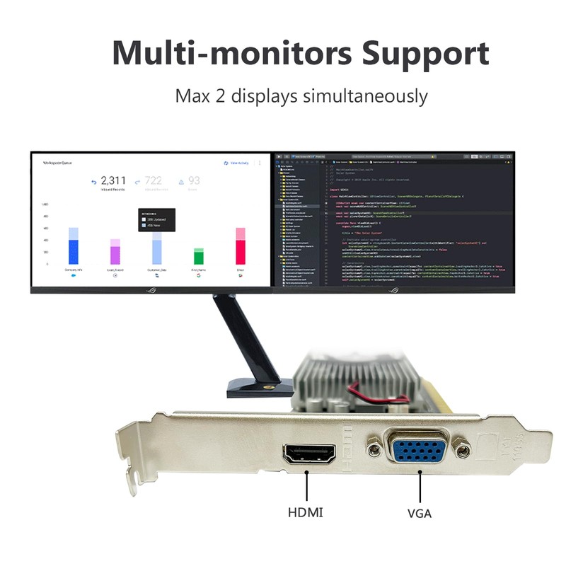 - PCI Express 2.0 interface,offers compatibility with a range of systems. Also includes VGA and HDMI outputs for expanded connectivity,supports up to 2 monitors.