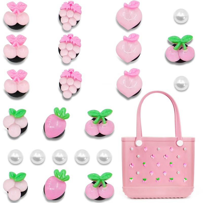 QTKJ 23 Pcs Charms for Bogg Bag, Cherries, Grapes and Carrots for Bogg Bag Accessories, Compatible with Women Rubber Beach Bag Tote Handbag Decoration
