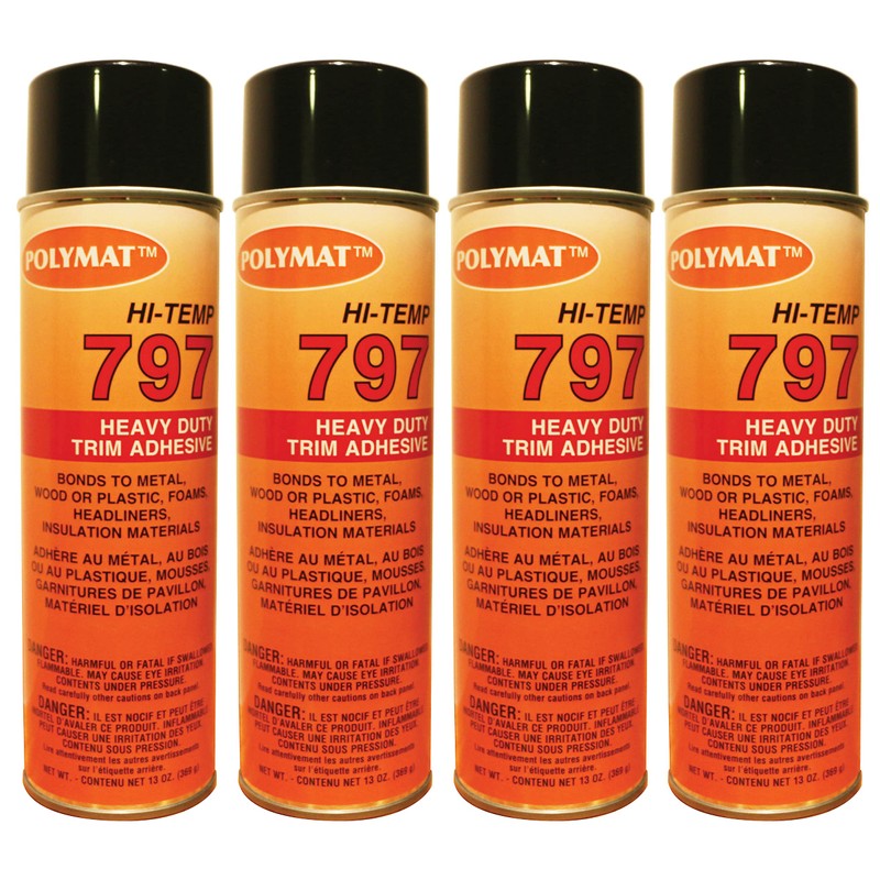 QTY (4) POLYMAT 797 20OZ CAN WITH 13OZ NET WEIGHT INDUSTRIAL GRADE Hi TEMPERATURE (160F) HEADLINER AND FABRIC WATER RESISTANT (FOR MARINE USE) INSTANT TACK SPRAY ADHESIVE GLUE CAN Fast drying, high tack glue. Heavy duty glue, great for gluing a wide range of materials (headliners, carpeting, foams, paper, cardboard, felt , cloth) to metals, wood and hardboard.
