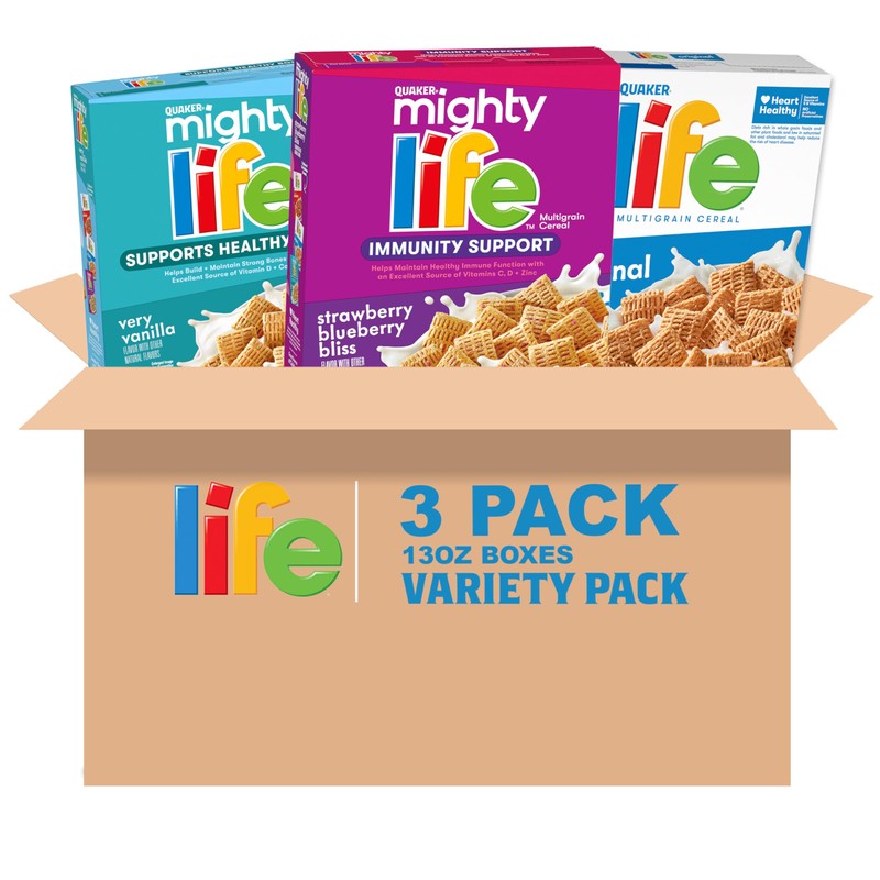• Quaker Mighty Life Multigrain Breakfast Cereal Variety Pack includes 3 (13oz) boxes of (1) Original, (1) Very Vanilla, (1) Strawberry Blueberry Bliss
