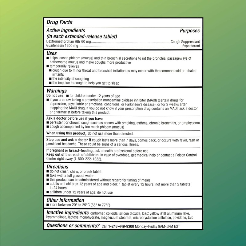 - Contains 1200 mg of Guaifenesin an Expectorant, and 60 mg of Dectromethorphan HBr a Cough Suppressant.