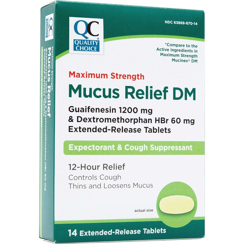 - Quality Choice Maximum Strength Mucus Relief DM Expextorant & Cough Suppressant Compares to the Active Ingredients in Maximum Strength Mucinex DM and comes in 14 Count Package of Extended Release Tablets