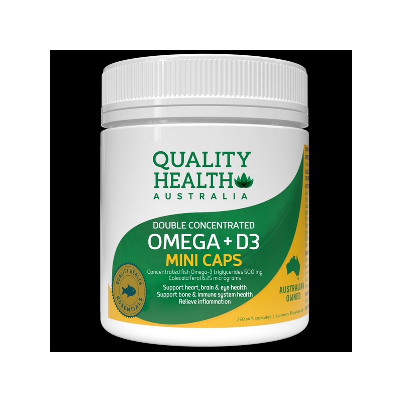 Quality Health Double Concentrated Omega + D3 is an easy-to-swallow mini capsule to support healthy brain, eyes, heart, bones and immune function and relieve inflammation.