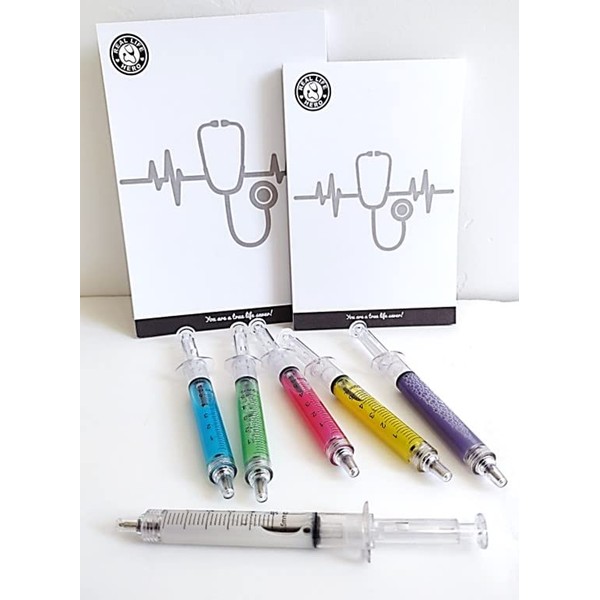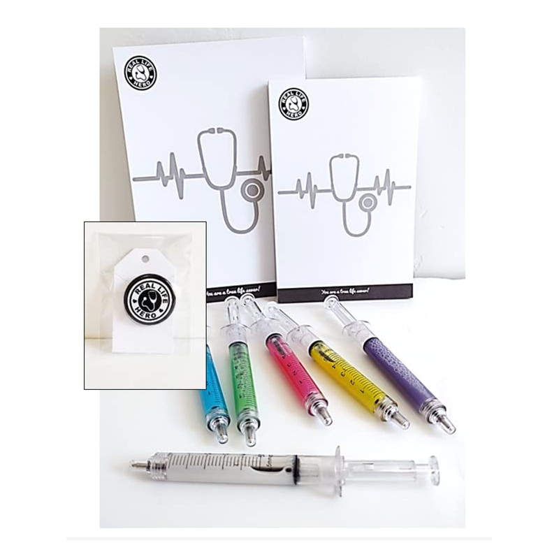 "Real Life Hero" Notepads & Matching 1.5" Button and 6-Pk Syringe Pens Gift-Set (Not gift wrapped) Syringe Pens: (6-PK) Each pack of syringe pens includes a total of 6 black ink pens in assorted colors. Syringe pens are a great novelty gift or accessory for kids, doctors, nurses, medical assistants, students, scientists etc. Great for note taking and multi-functional! Always strike up a conversation with patients and make a good gag gift for nursing/medical assistant graduates. Safe and easy to use. Not a real syringe. Simply push the top to expose the tip of the pen. Use the small white button to retract and hide the pen tip. Kids and adults love these pens shaped as syringes to play doctor or play pretend. MULTI- PURPOSE, GOOD QUALITY, 5 Inch Long, 0.7mm point black ink; 6-Pk Assorted Colors: Yellow, White, Blue, Purple, Green, Pink Note: After pen is not used for a while, you may need to shake it to mix display color well. (Qty 2 - Notepads) Two premium notepads in two different sizes. Attractive repetitive imprint. Each contains 50 sheets of paper glued together at the top. Designed with a light grey background image of a stethoscope with heartbeat. It also includes a small impression of the slogan "Real Life Hero" on the top left. At the bottom of the paper it reads "You are a true life saver!" These pads have plenty of paper to take notes for a long time. Perfect gift for anyone in any type of medical setting who you would like to show your appreciation. Great gift to say thank you to any medical hero. 50 sheets of 70 lb. Premium Paper Uncoated Glued at the Top Padded With Cardboard Back. (Button - Qty 1) Button reads "Real Life Hero" with stethoscope design. Combines well with mug as part of a gift to someone special. Provide as recognition, encouragement, appreciation, or any other occasion. High Quality Pin-Back Button, Black, Round, 1.5", Individually packaged.