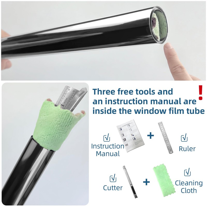 Note:1.The mirror effect will be reversed at night, because at night the sun's rays disappear, the light inside the room is brighter than outside, so you need to close the curtains at night to ensure privacy! 2.To prevent scratching the window film surface during installation, wrap the squeegee with a towel or place the backing film on the installed window film. 3.After installing the window film, if you notice small bubbles/water stains that are difficult to remove, please be patient. These bubbles/water stains will naturally evaporate over time.4. Please note that the window film may appear temporarily blurry after installation. After some time, the window film will gradually regain clarity.