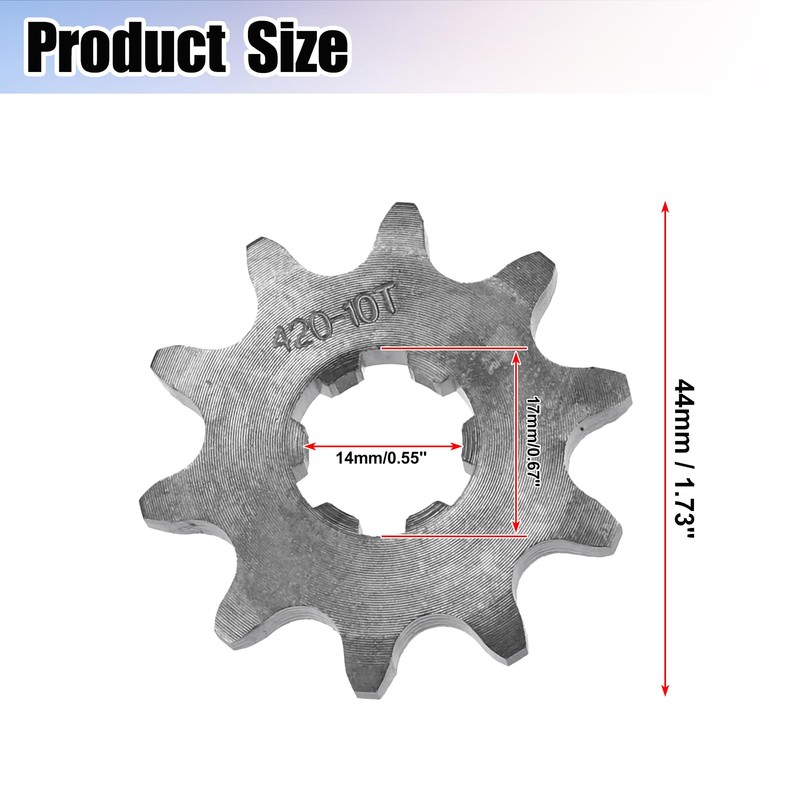 - Size: front sprocket 420, chain 10 teeth, 17 mm. Mounting Hole Diameter: 17mm/0.67", Gear Inner Diameter: 14mm/0.55".