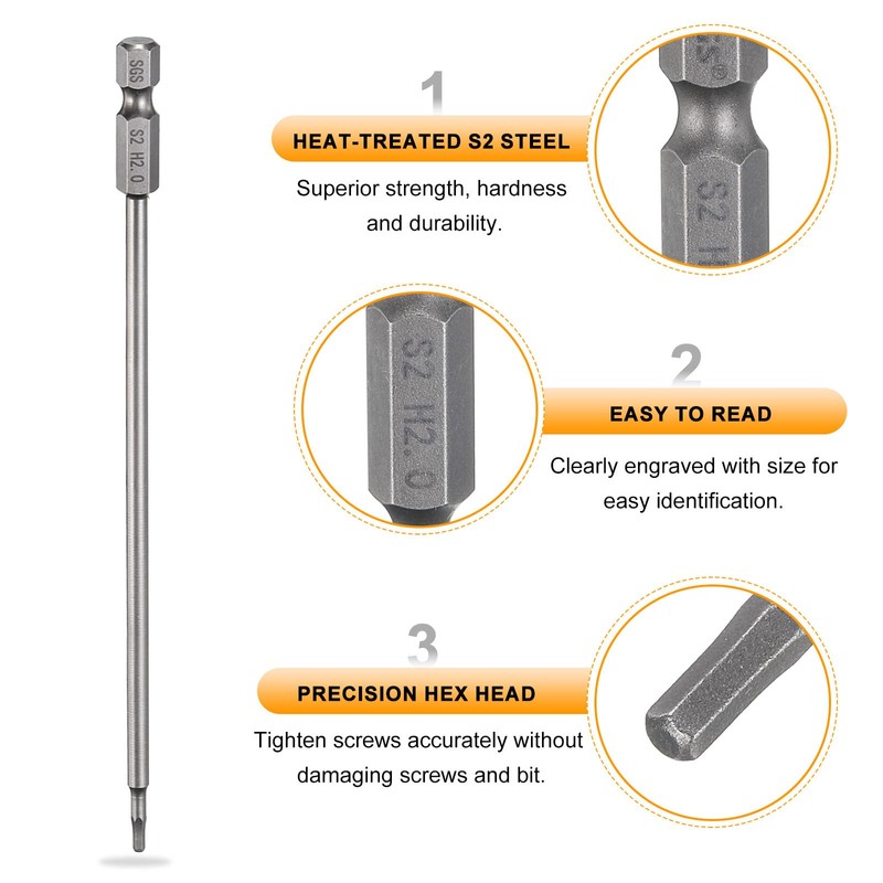 QUARKZMAN 2 mm (H2.0) 200 mm Long HRC60±1 Hardness Hex Bits, Hexagon Hex Screwdriver Bit Set 1/4 Inch Magnetic S2 Steel Key Hex Bit Set