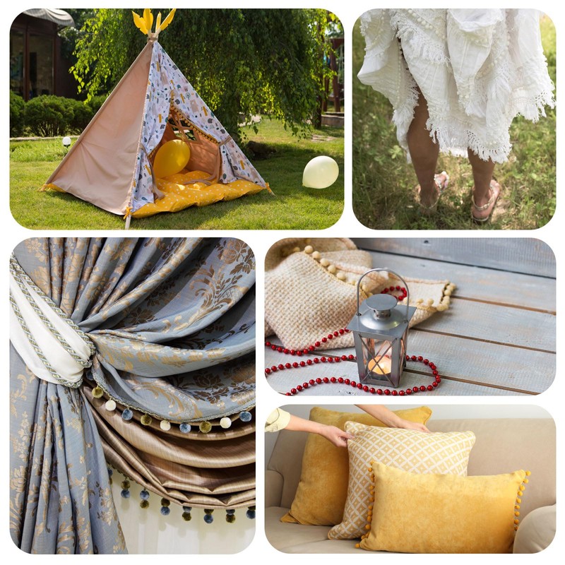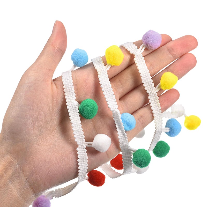 - Pom pom fringe trim - Made of polyester material, soft and comfortable to the touch. The colorful ball fringe trim is a decorative trim that consists of mixed colored small balls attached to a string.