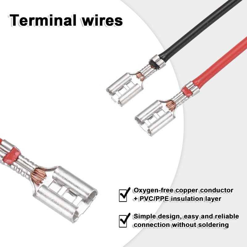 - Color: Red and Black; Length: 0.30 m/11.8 inch; Applicable size: 4.8mm; Style: Both ends; Material: copper, PVC; In the packaging: 20pcs x Spade Crimp Terminals with wires