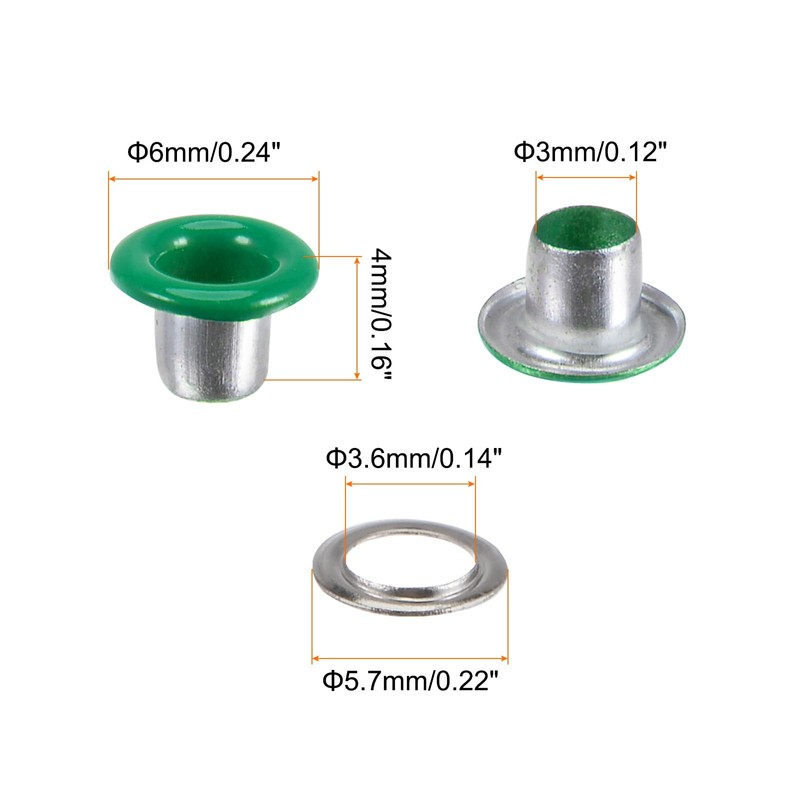 - Size - The eyelet size is 3mm/0.12" inner diameter x 6mm/0.24" outer diameter. The size of the washer is 3.6 mm/0.14 inch inner diameter x 5.7 mm/0.22 inch outer diameter.