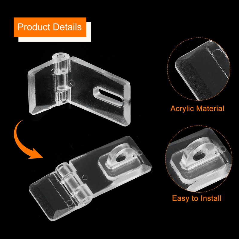 - [Acrylic Hasp Latch] – Total Size: 40 x 16 mm/1.57 inches x 0.63 inches (L x W); Mounting Hole Size: 11 x 3 mm (L x W); Hasp Lock Size: 13 x 12 mm (L x W); Hasp Lock Mounting Size: 5 mm; Box contents: 4 pieces x hinge hasp