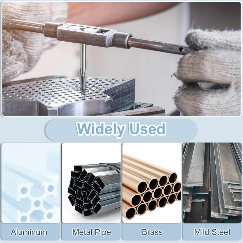 • Wide Applications Hand taps are mainly used with tap dies and are suitable for re-cutting damaged or stuck threads or creating new threads. The thread tools are used for thread cutting through or in flat holes in soft steels, aluminum, iron, copper, hard plastic.