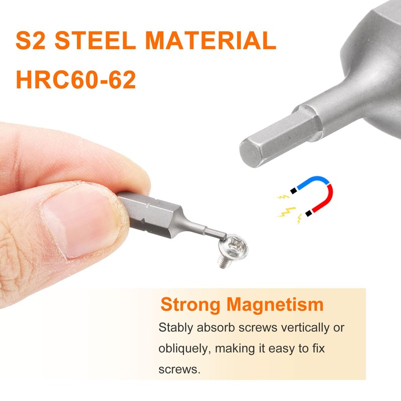 - Material - The screwdriver bits are made of specially heat-treated S2 steel with high strength and hardness (HRC58-62), are durable and bend-resistant, and the surface is sandblasted for improved grip and corrosion resistance