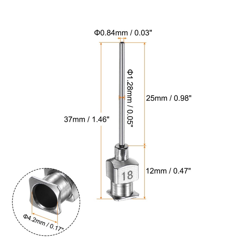 - Size - Length of blunt needle: 25mm/0.98"; Connection hole diameter: 4.2mm/0.17"; Total length: 37mm/1.46"; Tube outer diameter: 1.28mm/0.05"; Tube inner diameter: 0.84mm/0.03"; Connector length: 12 0.47 inches