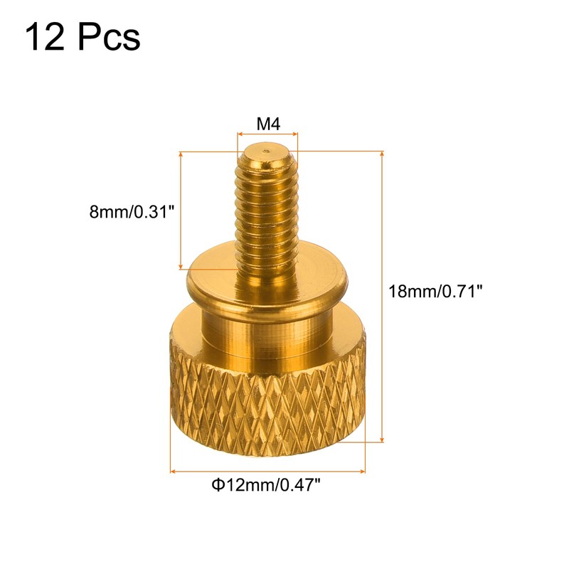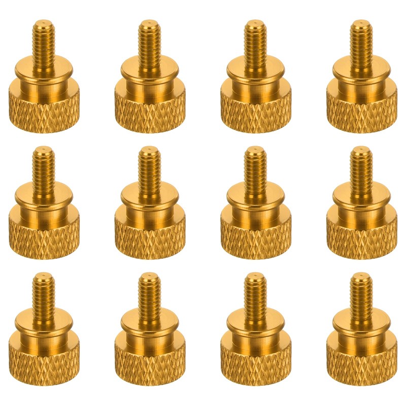 - PC housing thumb screw; colour: gold; thread diameter: M4; thread length: 8 mm/0.31 inches; height: 12 x 12 x 18 mm/0.47 x 0.47 x 0.71 inches (L x W x H); material: aluminium alloy; package contents: 12 computer case thumb screw