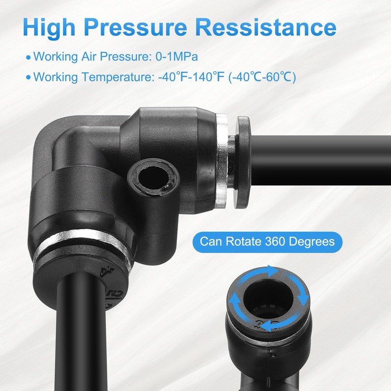 - Size - 90 degree push to connect fitting are 1/2 inch and 5/16 inch pipe outer diameter; outer diameter:19mm/0.75 inch, length:36mm/1.42 inch and 32mm/1.26 inch, working temperature range: -40~60℃, working pressure range: 0-1MPa, final pressure: 1.6 MPa