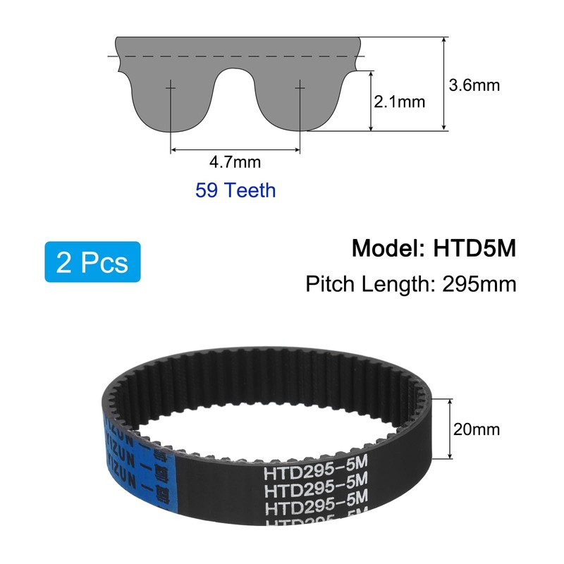 • Size: HTD5M (High Torque Drive) timing belt with 295 mm pitch length, 20 mm width, 3.6 mm height. Curved shape for better power transfer and reduces the risk of slipping.