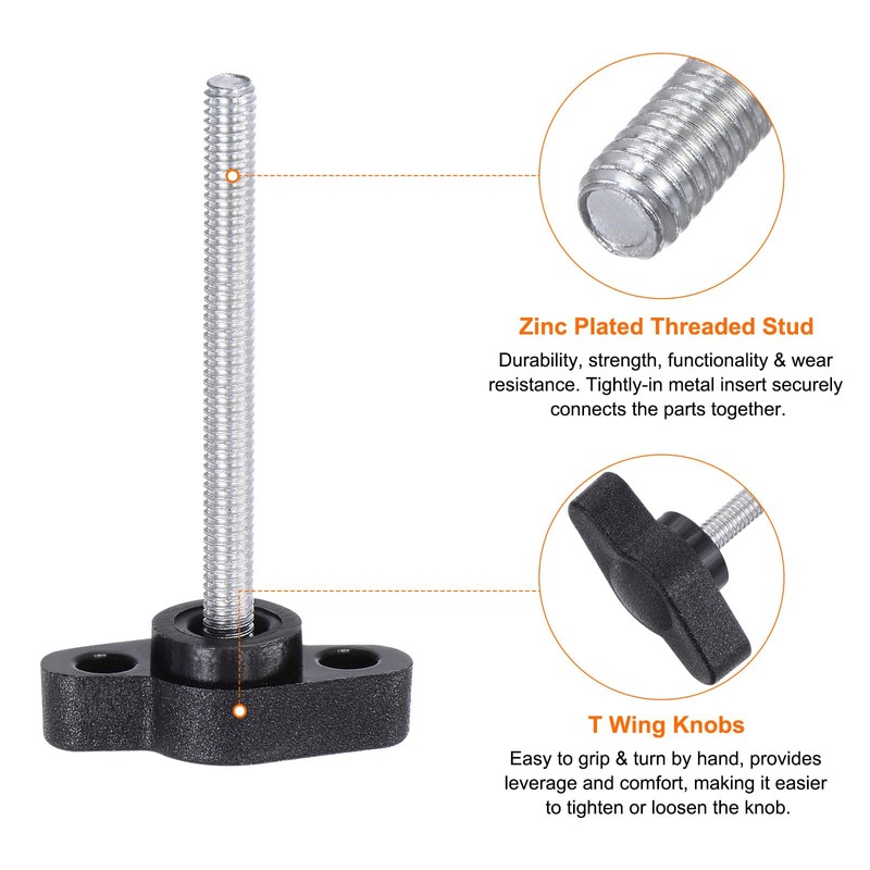 The firmly pressed metal inserts are machine injected at high temperatures to securely connect the parts together, easy to install. T-wing knobs are easy to grip and turn by hand, providing leverage and comfort, which makes it easier to put on or loosen the button. The threads are neat and clear, the force is uniform and deep, not easy to slip, and there are no burrs.