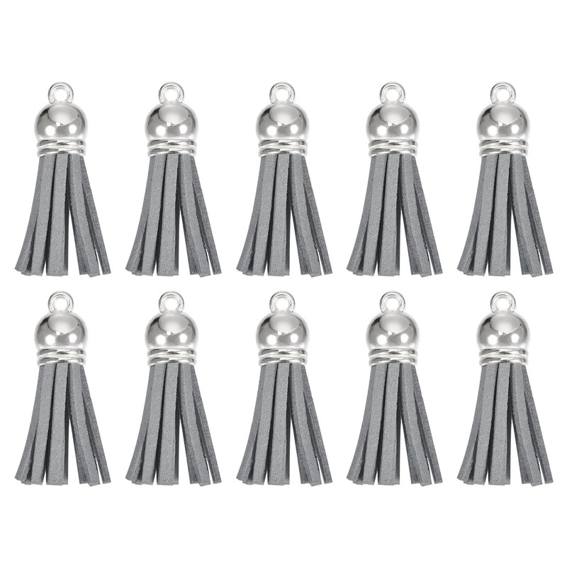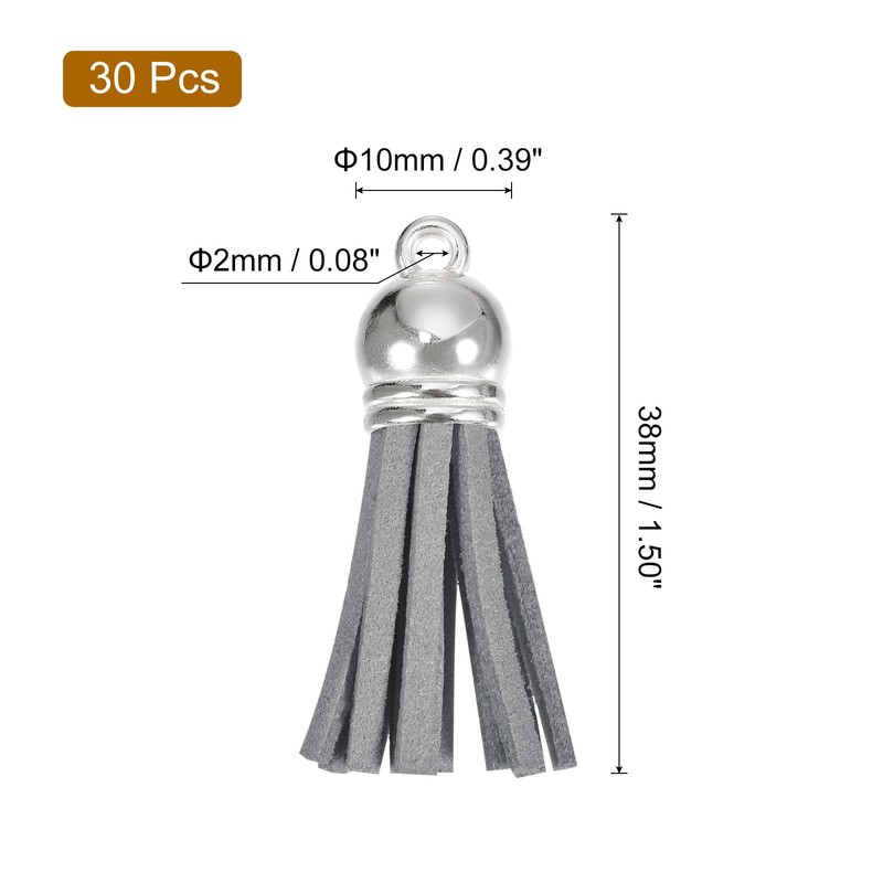 QUARKZMAN Pack of 30 1.5 Inch Leather Tassels Key Chain Charm with Silver Cap for Pendant Bracelet Jewellery Making DIY Craft Decoration, Grey