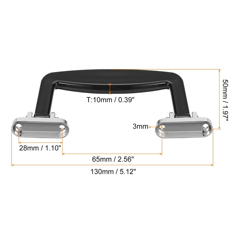 - [Luggage handles] – Material: Plastic; Mounting Hole Dia. : 3 mm; mounting hole spacing. : 28mm/1.10", 65mm/2.56"; Thickness: 10mm/0.39"; Total Size: 130mmx50mm/5.12"x 1.97"; Package Content: 6pcs x Luggage Handle; 24pcs x Screws