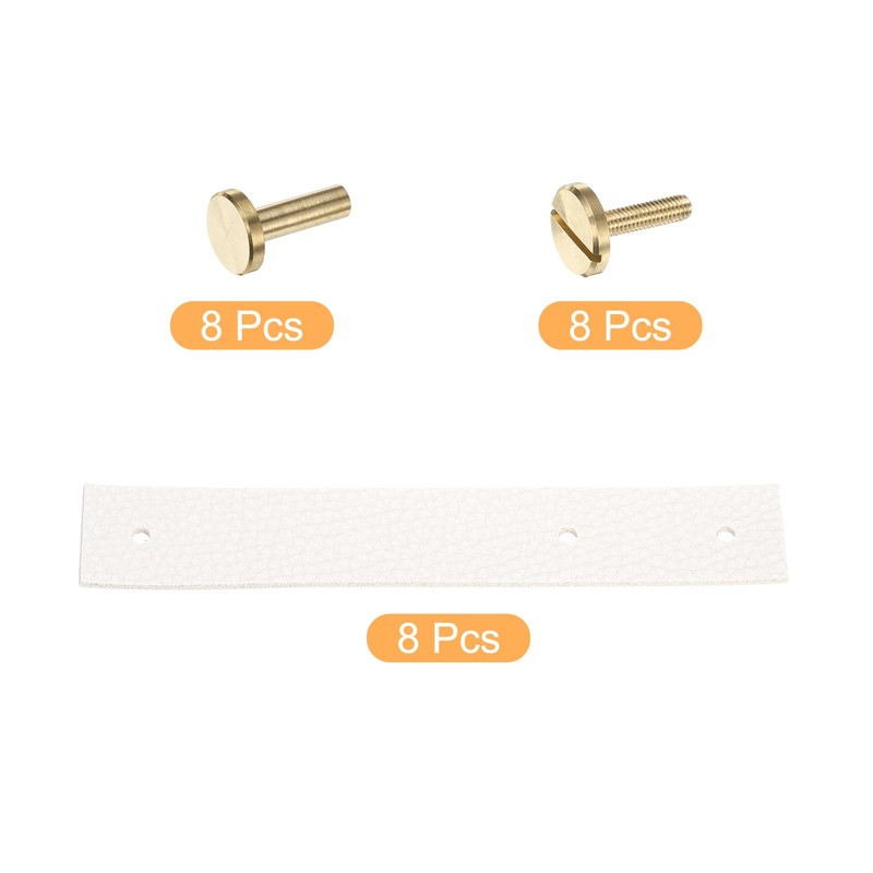 • Size and Packaging This set contains 8 pieces leather drawer knobs, which have a size of 14.6 x 2.5 cm/6 x 1 inch (L*W). The screw size is 15 x 10 mm/0.6 x 0.4 inches (L x W). They can be used as replacement knobs for drawers, cupboards and kitchen cabinets.
