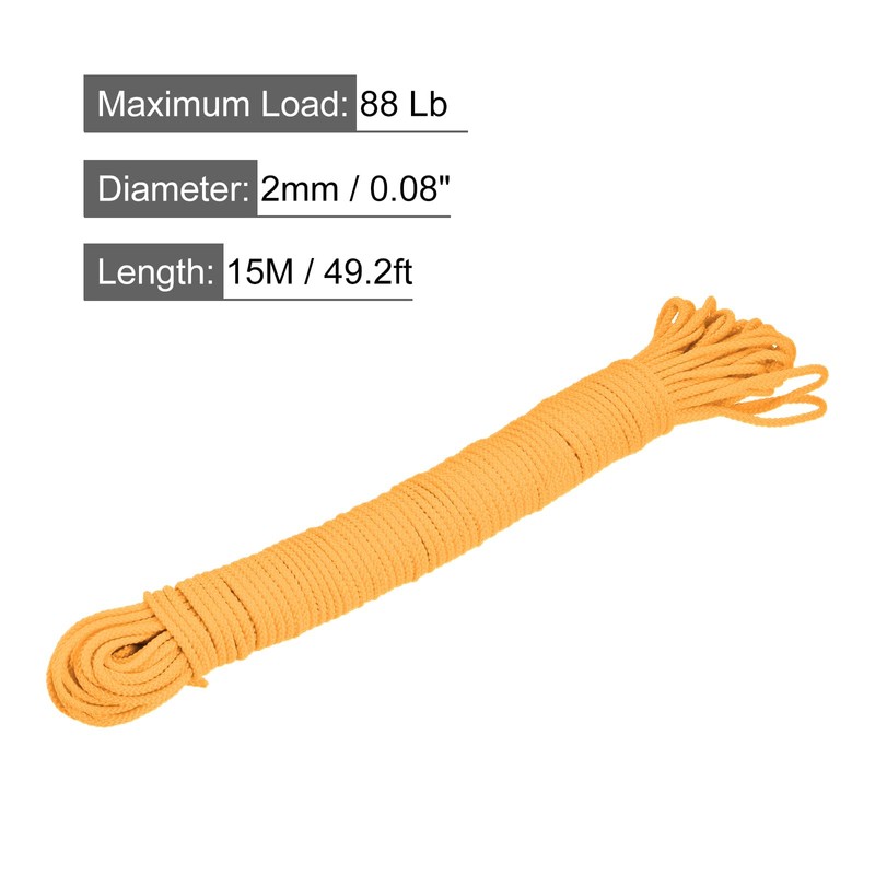 - Packung mit 1 Polypropylen-Seil; Durchmesser: 2mm/0.08 Zoll; Länge: 15M/49.2ft; Maximale Belastung: 88 Pfund; Innenkern: Polyester