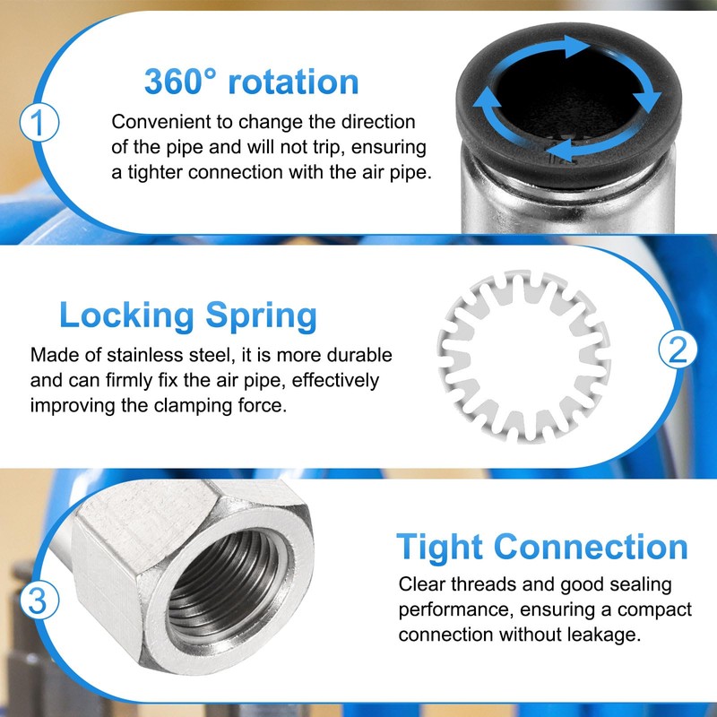 - Feature - One end is female thread and the other end is push-to-connect tube connector, providing a quick and easy connection, and the air pipe can be easily inserted or removed without any tools. After installation, the release cap can also be rotated 360 degrees to facilitate changing the direction of the pipe. A stainless steel circlip is designed inside, which is more durable and can firmly fix the air pipe.