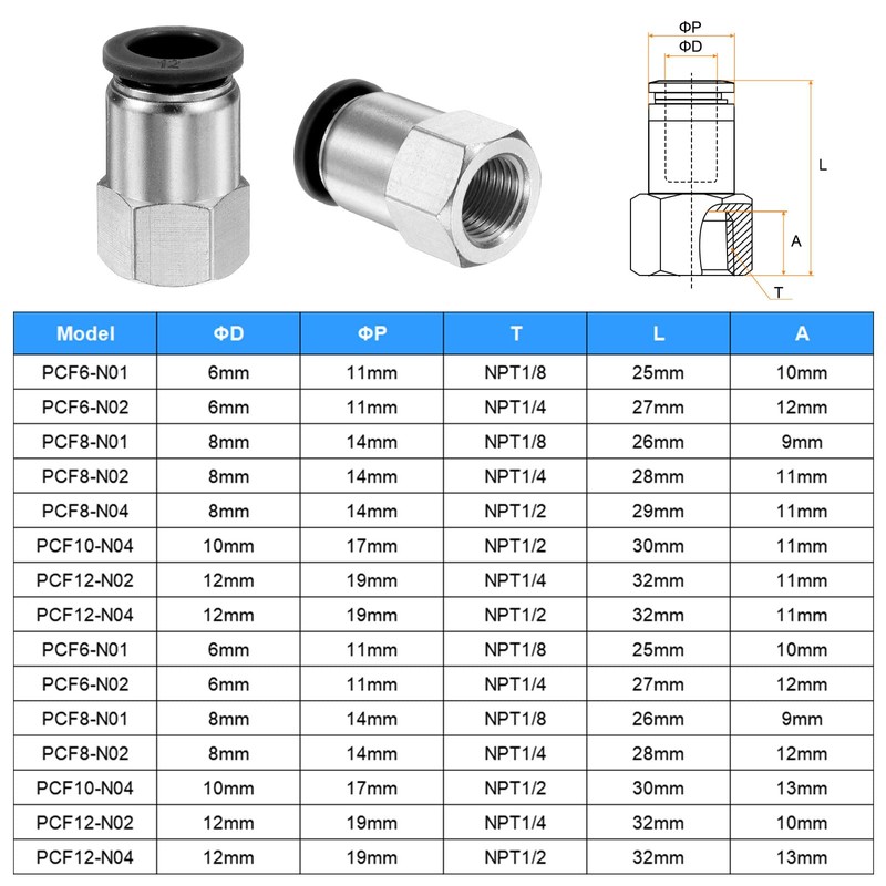 - Size specification: 12 mm tube OD x 1/4 inch NPT thread; model: PCF12-N02; type: female straight; operating pressure: 0 - 1 Mpa / 0 - 145 psi; proof pressure: 1.6 Mpa / 232 psi; working temperature: -40 °C - 60 °C / -40 °F - 140 °F