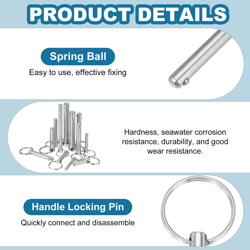 The quick release pin is made of carbon steel with high hardness and good wear resistance, as well as seawater resistance and durability. The pull ring can prevent the loss of the anti-lost cord. The handle locking pin can quickly connect and disconnect two or more parts, effectively fix and loosen mechanical parts. It is not recommended to use it in a marine environment or in a warm and humid environment for a long time.