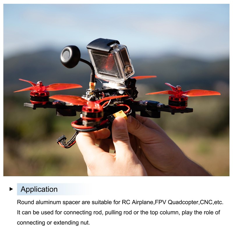 - Round aluminum spacer, suitable for RC plane, FPV quadcopter, CNC, etc.Can be used as connecting or extension nut for connecting rods, tie rods or top pillars.
