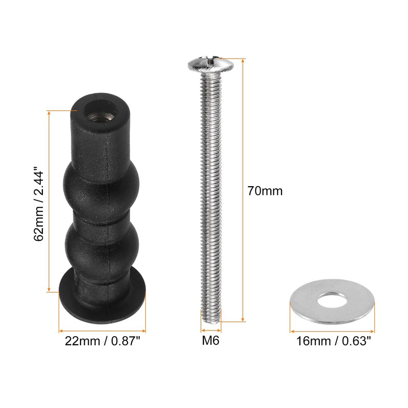 - Rubber sleeve size: 62x22mm/2.44"x0.87"(LxW) (unextended condition); screw size: M6x70mm(DxL); spacing: 1mm/0.04"; stainless steel washer: 16mm/0.63"; package content: 2 set toilet seat hinges screws