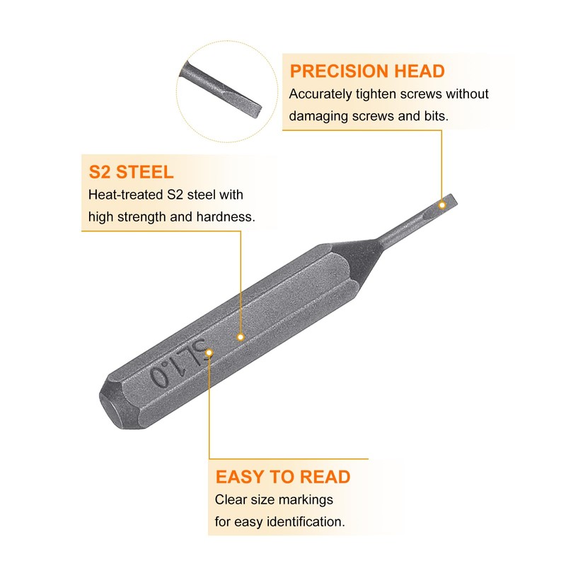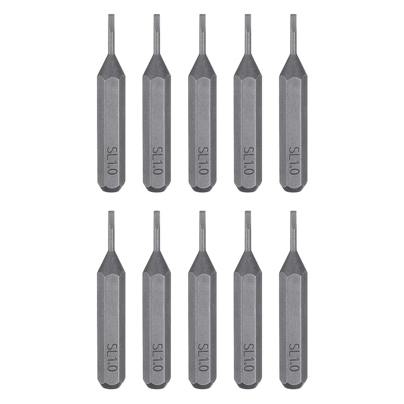 - Size - SL1.0; total length: 28 mm/1.1 inches; shank: 4 mm/5/32 inch hex shank; flat slotted head drill specially designed for effortless screwing of screws into wood, metal and other materials. Can tighten screws precisely without damaging screws and screwdriver bits