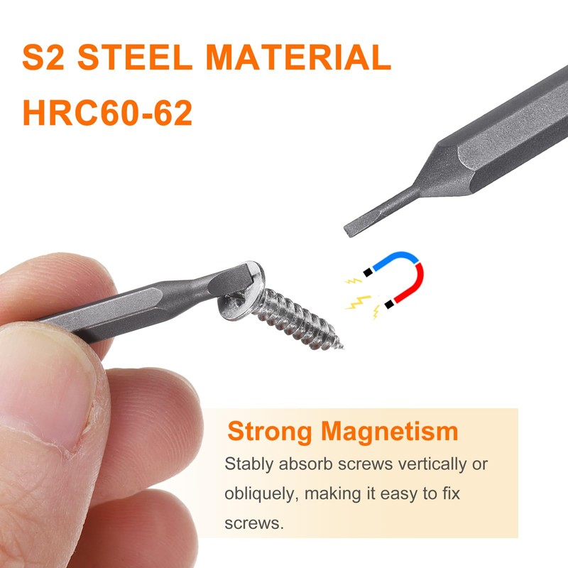 - Material - The screwdriver bits are made of specially heat-treated S2 steel with high strength and hardness (HRC58-62), are durable and bend-resistant, and the surface is sandblasted for improved grip and corrosion resistance