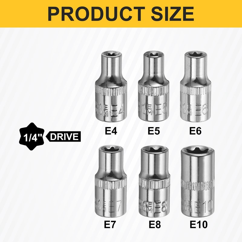 - Size - Drive: 1/4 inch; Torx bit set specifications: E4, E5, E6, E7, E8, E10; Total length: 25 mm/1 inch; Package includes: 6 x external Torx socket. The specifications of the socket are visible and engraved on the surface. You can quickly switch between different socket sizes to improve work performance.