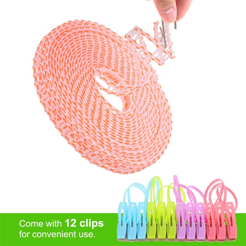 QUARKZMAN Windproof Clothesline, 8 m 26 ft Plastic Non-Slip Washing Line with 12 Clips, Portable Washing Line for Outdoor Camping and Travel, Orange