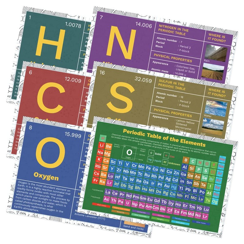 - Six Posters: 1) Hydrogen; 2) Carbon; 3) Oxygen; 4) Nitrogen; 5) Sulfur; and 6) Periodic Table of Elements.