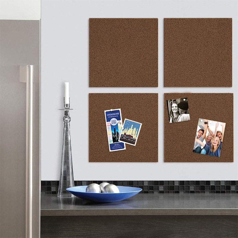The tiles can be used alone or as a group to create a fully tackable cork bulletin board.Cork tiles offer virtually unlimited versatility. Modular functionality allows each 12" x 12" cork tile to be used alone, or placed alongside other tiles to maximize the tackable surface. The frameless design of the tiles allows them to hang seamlessly next to each other, or you can leave space in between for a more creative, and stylish look. Like with any standard bulletin board, items can be quickly and easily tacked up on durable cork surface using push pins. The cork is all natural and has a self-healing feature so that unsightly pin holes will not be left behind when you take down your display items. At 1/4" thick, the cork also has the ability to absorb noise which is an added plus in busy households and work environments. Mount cork tiles to any wall, in any configuration, with the included self-stick adhesive tape and you've got a custom cork board. Cork is designed for light use and is suitable for work, home or school display purposes or for use in arts and crafts projects. 100% Satisfaction Guaranteed.