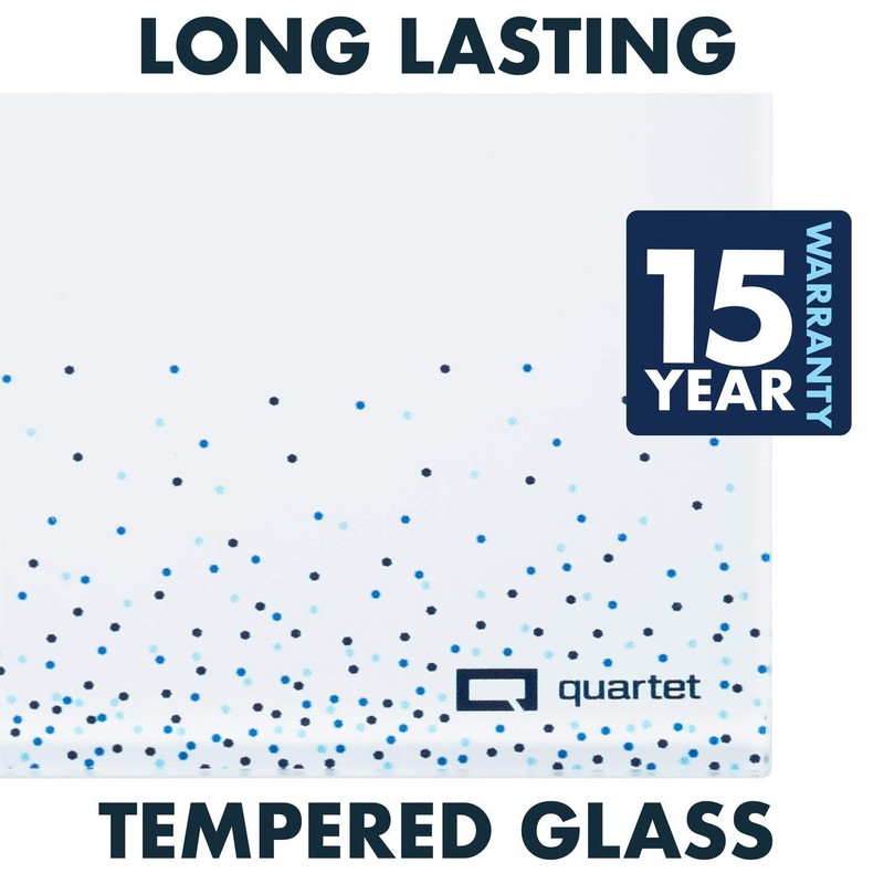 Be prepared to write whenever inspiration strikes with Quartet Glass Dry-Erase Notepads. These dry-erase notepads lie flat on your desktop for quick notetaking, brainstorming and more. Create a fun and modern workspace with the sleek white and colorful dot design. These notepads are made with non-absorbent glass, which lets you write, erase and rewrite on a clean surface every time. They will not stain or ghost, so your message can be communicated without distracting streaks. The tempered glass also resists scratches and dents and comes with a 15 year limited . Plus, 4 anti-skid feet prevent sliding, so the board stays in place as you write. Each notepad measures 9" x 6". Pack includes 1 white notepad, 1 dot pattern notepad and 2 dry-erase markers. For best results, use Quartet Glass Board Accessories, sold separately.