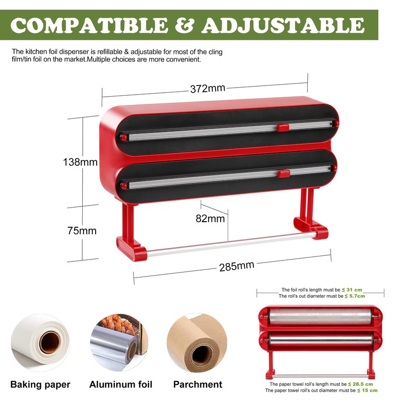 Quasziwa Aluminum Foil & Plastic Wrap Dispenser with Cutter - Magnetic & No-Drill Wall Mount, Cling Film Dispenser with Paper Towel Holder, Space-Saving 3-in-1 Kitchen Organizer - Fits 12" Roll, Red