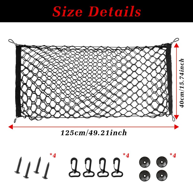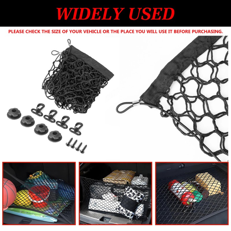 1. Fit for Most Cars: our cargo net Tensile state size is 125cm (49.21") x 40cm (15.74"),This cargo net stretches largely around your stuff and you can cram even more things in it than ever before.