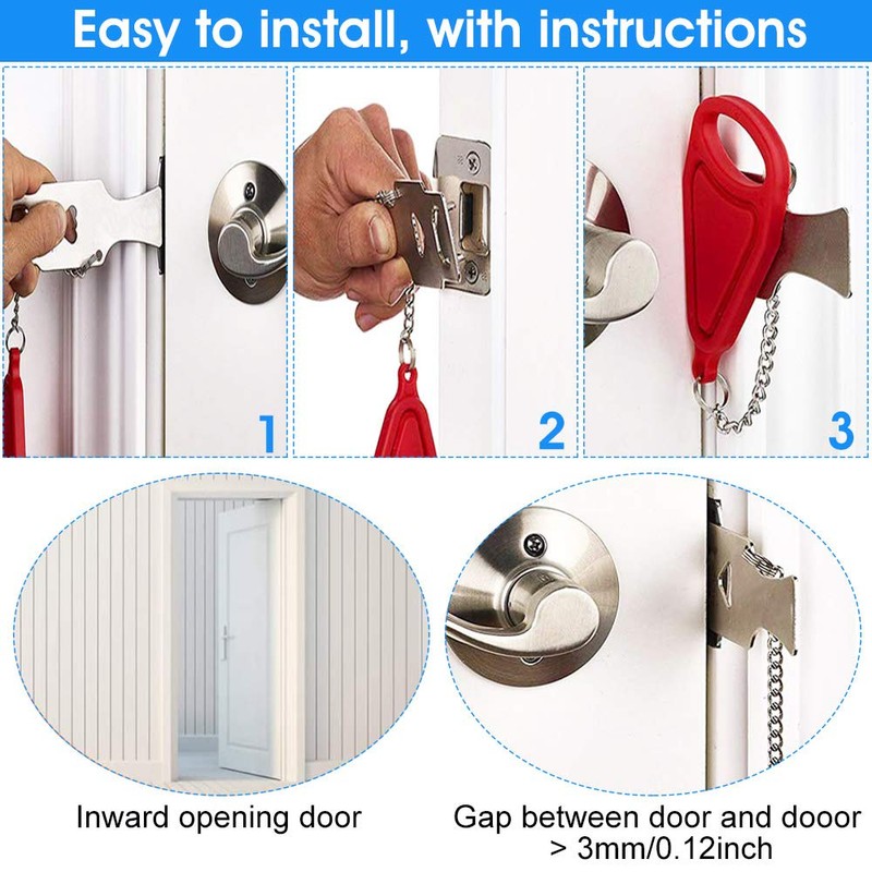 - 🔏【Easy to Install & Take】:You can easily install the travel door lock without installing any tools. Just insert the metal piece into the groove of the door lock, close the door, and then put the red handle groove on the stud on the metal piece. In an emergency, you The lock can be removed in a few seconds in the dark.