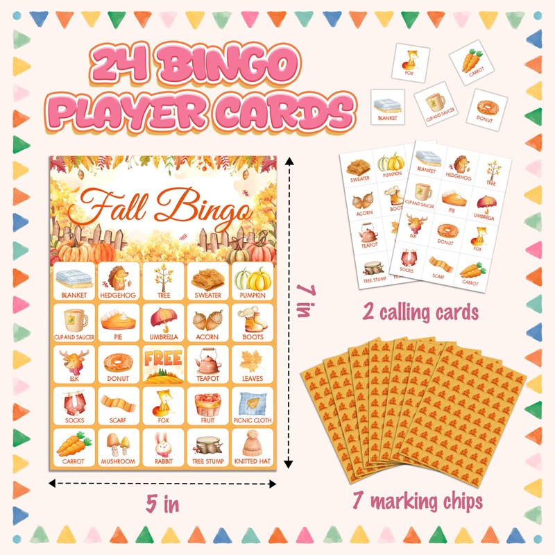 QUDNCR Fall Bingo Game, Autumn Party Bingo Cards for Adults, Fall Harvest Party Decorations Supplies, Autumn Themed Birthday Favors for 24 Players, 08
