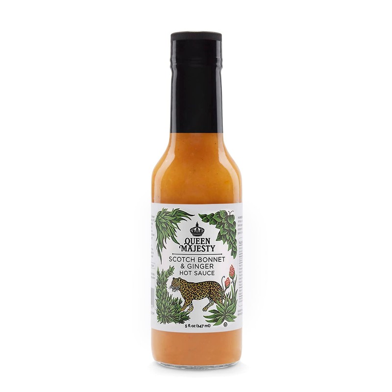 Queen Majesty Scotch Bonnet & Ginger Hot Sauce, 5 oz - All Natural Scotch Bonnet, Habanero, & Ginger Condiment - Vegan, Kosher, Gluten Free, non GMO, No Sugar, Award Winning & Featured on Hot Ones