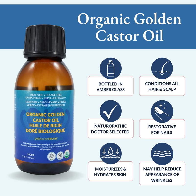 Queen of the Thrones Organic Golden Castor Oil 100 mL| 100% Pure, Certified Organic, Hexane-Free, Extra Virgin | Moisturizing & Conditioning Oil for Skin, Hair & Nails