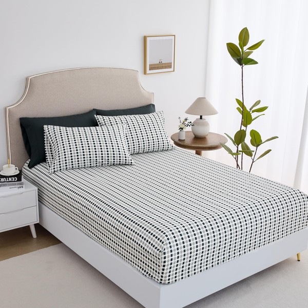Queen Size Bed Sheets Set Deep Pockets - 6PC Print Ultra Soft Microfiber Bed Sheets - Easy to Clean, 90 Thread Count Sheets Includes 1 Fitted, 1 Flat, 2 Pillowcases (Black/Grey Squares)