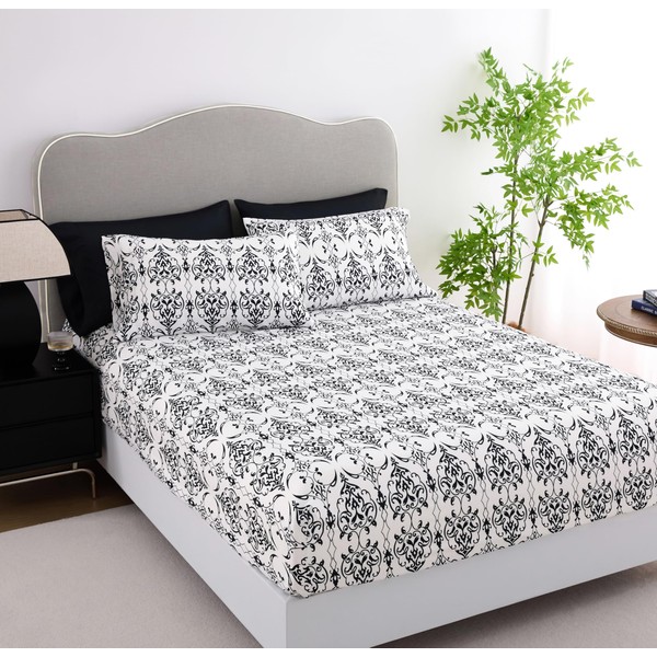 Queen Size Bed Sheets Set Deep Pockets - 6PC Floral Ultra Soft Microfiber Bed Sheets - Easy to Clean, 90 Thread Count Sheets with Fitted Sheet, Flat Sheet & Pillowcases (Black/White Scroll)