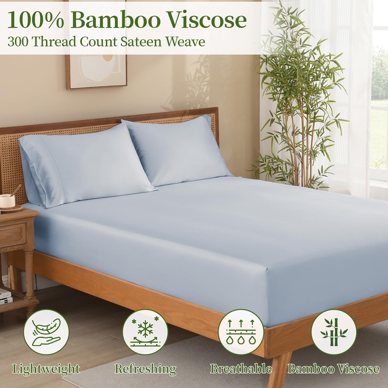 Queen Size Fitted Sheet Only, 100% Viscose from Bamboo, 300TC Sateen Weave, Silky Soft, Cooling, 16" Deep Pocket, All Round Elastic, No Slip, No Pilling, Blue