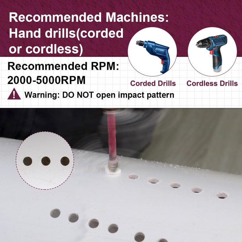 • Attention : Suitable for hand drills including corded drills and cordless drills, etc. Cordless drills with voltage lower than 24V are not recommended. Do not use impact pattern. Pay attention that some materials require water to cool