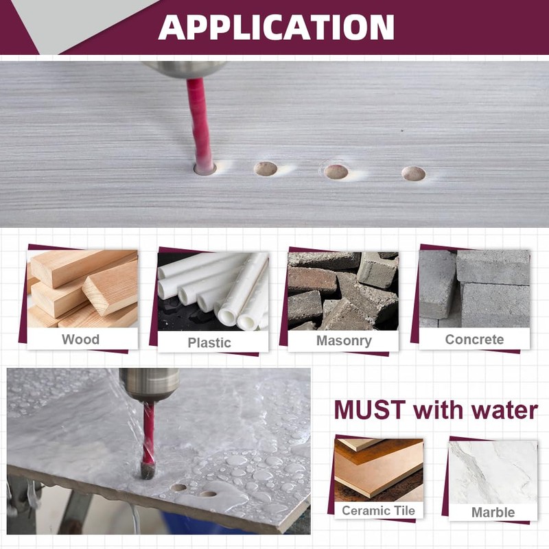 • Application : For drilling and positioning. Suitable for wood (without nails), plastic, masonry, concrete, etc. Water is a MUST when drilling ceramic tile and marble (10 holes at most for them). Failure to add water will shorten its lifetime severely