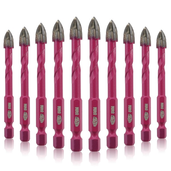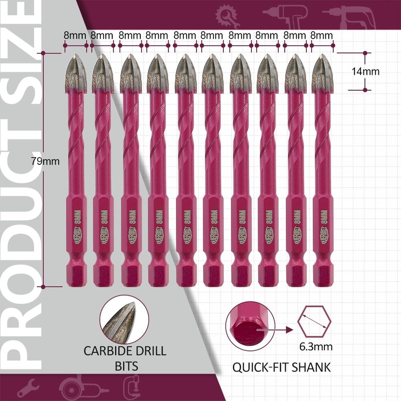 QUEFORET Masonry Drill Bits Set 5/16 Inch (8mm) - 10pcs Carbide Drill Bits for Wood Plastic Masonry Concrete, Wet Drilling Ceramic Tile Marble, Quick Change Hex Shank
